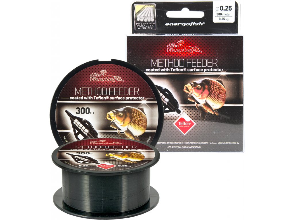 V rámci feederového lovu je snad nejoblíbenější metodou method feeder. Mnoho rybářů tento způsob používá na vysoké úrovni, musí se i vlasce přizpůsobit navýšením nárokem. Jeden dobrý method feeder musí být potřebně silná, protože nejčastější je cílovou rybou kapr. Kapři nebývají velkých rozměrů, ale často se na háček dostanou při této metodě i kapitální kapři, klidně i 20 kilogramové. Nemluvíme o divoce se bránících amurech, které jsou známí přetrháváním vlasců v blízkosti břehů. Musí disponovat minimální průtažností, protože ne vždy jsou náhozy nad 100 metrů, kdy při vlasci s větší průtažností projde množství času, než pocítíme záběr. Průtažnost u klasického monofilového vlasce je 10%, co znamená, že 100 metrů nahozeného vlasce se dokáže natáhnout o 10 metrů! Jestli si představíme, že jestli ryba potáhne vlasec o 10 cm, tak při této průtažnosti na břehu nepostřehneme vůbec nic. Proti tomu průtažnost vlasce Carp Expert Method Feeder je pod 5%, takže můžeme rychle vypočítat, že dvojnásobně rychleji postřehneme záběry. Jestli se ryby krmí opatrně, je málo záběrů, jen tato vlastnost nám může napomoct k tomu, abychom nešli domů s prázdnými rukami. Měkčí vlasec se odvíjí z cívky mnohem snadněji, díky čemu s nimi dokážeme nahodit do větších vzdáleností. Mimochodem, lépe se s nimi pracuje z hlediska vytváření systémů a spojování. A nyní jsme se dostali k druhé nejdůležitější extra složce, teflonový potah. Ten je pro nás důležitý, protože vytváří mikro vrstvu na povrchu vlasce, díky klouzavému charakteru mnohem lépe proklouzne přes očka prutu, méně se bude náš vlasec opotřebovávat, čím se zvyšuje jeho životnost. A už vůbec se nemusíme bát toho, že by se naše spoje rozdělily.