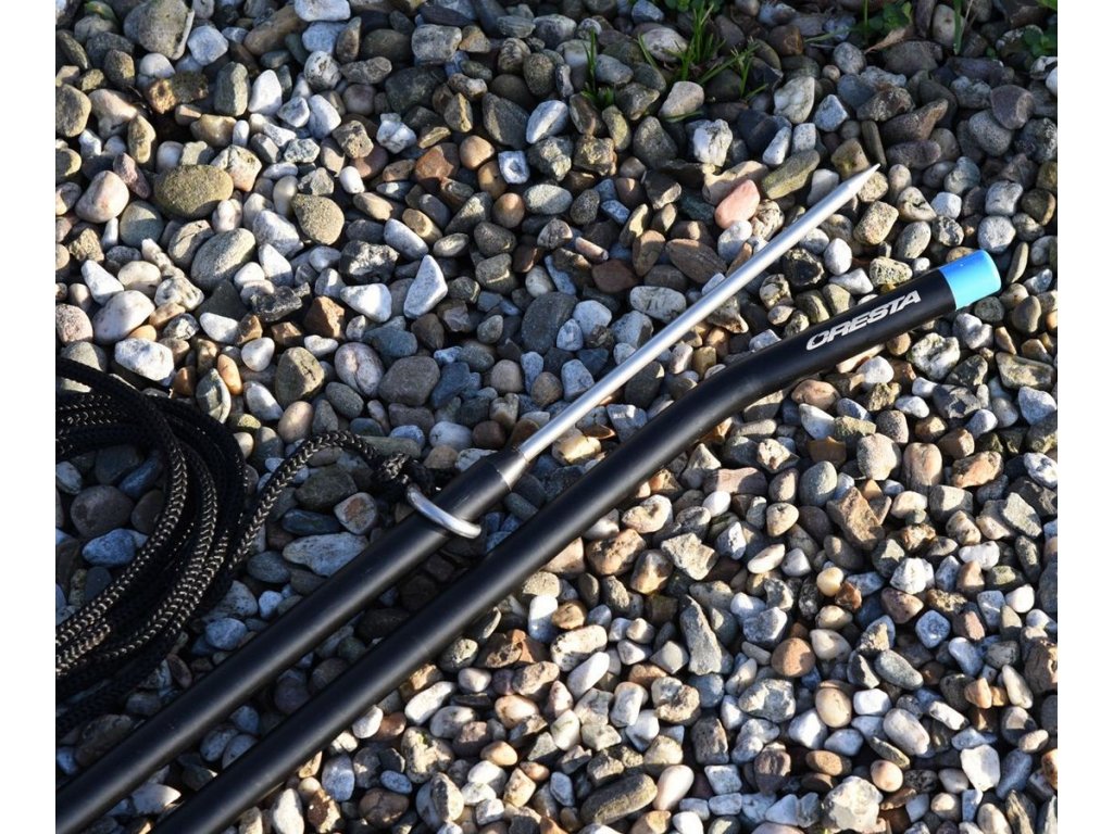 CRESTA Spiked Measure Sticks. Měřící tyče s hrotem jsou ideálním způsobem, jak měřit preferovanou vzdálenost rybolovu. Přesnou vzdálenost snadno určíte omotáním vlasce okolo tyček dokud není dosažen klip na vlasec na cívce navijáku. Dodávaná šňůra má délku 5 m a je osazena 3 posuvníky pro přesné značení. Obě tyčky jsou vybaveny pevným kolíkem, který lze snadno a bezpečně zapíchnout do jakéhokoliv povrchu. 70 cm délka tyčky nad hrotem zajišťuje, že omotaný vlasec zůstane vždy nad vegetací. Hladké provedení tyček a plastového krycího knoflíku zajišťuje snadné navíjení vlasce bez poškození.