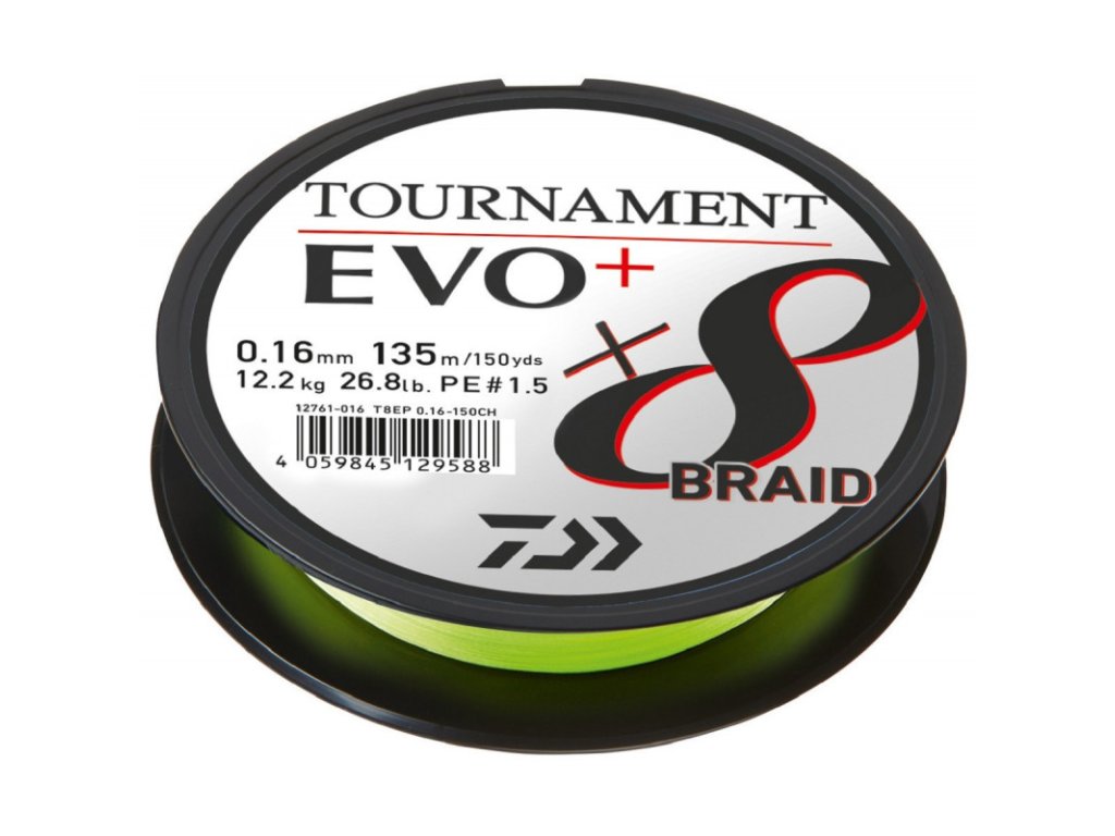 Dobře známá pletená šňůra Tournament 8 byla ještě zdokonalena, a tak vznikla verze Evo+. Zejména povrchový potah byl vylepšen větším množstvím silikonu, což vede k menšímu tření během náhozu a delším hodům. Navíc je redukován zvuk vznikající při průchodu očky. Díky tomu je nová šňůra Tournament 8 Braid Evo+ technicky jednou ze světově nejlepších šňůr na trhu. Povrch verze Evo+ se netrhá a nepraská, a to ani při častém použití, a udržuje si kulatý profil. U nového obalu jsme také navíc snížili použití plastového materiálu o více než 50 %. Dostupné barvy: tmavě zelená, bílá, chartreuse, multi-color (vícebarevná)