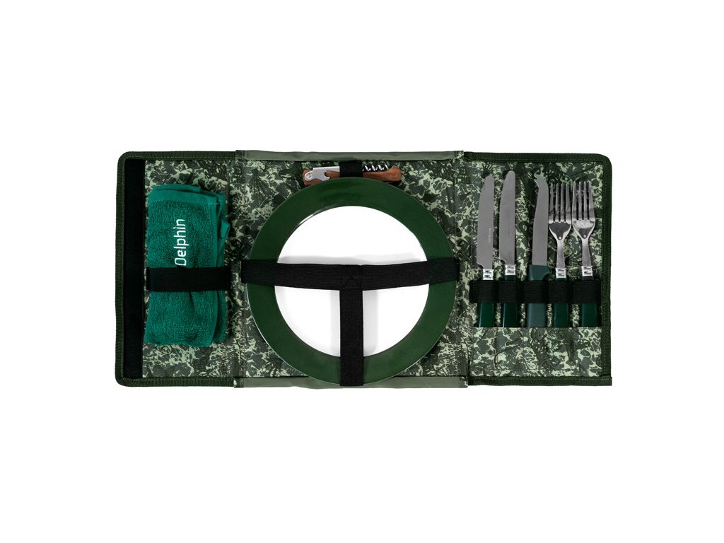 Jídelní souprava, která vám iv odlehlých oblastech kempování dopřeje komfort civilizace :) V chytře složeném setu naleznete úhledně uložené dva plastové talíře, multifunkční nůž (otevírá
