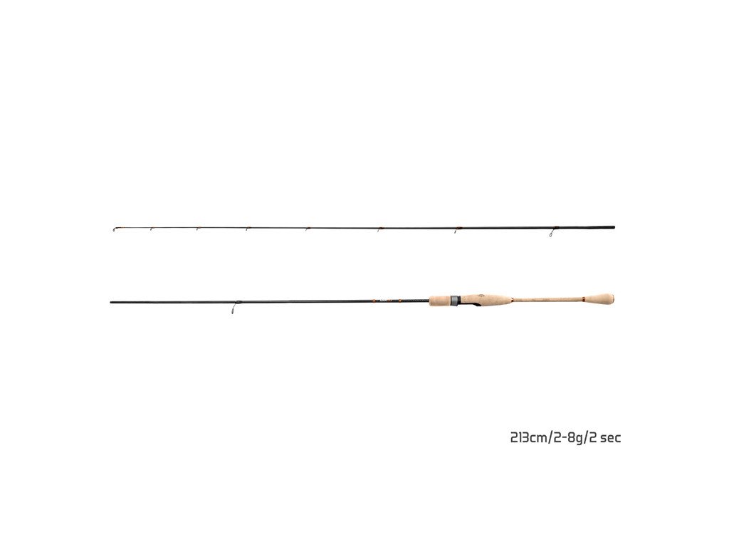 Model: 213cm/2-8g/ Počet dílů: 2 Průměr blanku nad rukojetí: 7,0 mm Počet oček: 9 (seaguide) Transportní délka: 108,5 cm Hmotnost: 98 g Rukojeť: Dělená, dva typy korku (korek, ThinCORK) Délka rukojeti (od spodní části prutu po střed sedla: 31 cm