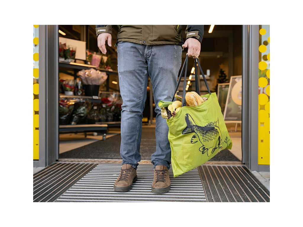 Užitečná nákupní taška, potištěná jedinečným designem kapra nasávajícího kaprový návazec s nástrahou. Díky praktickým rozměrům v rozloženém ale i složeném stavu si najde široké uplatnění nejen u rybářů.