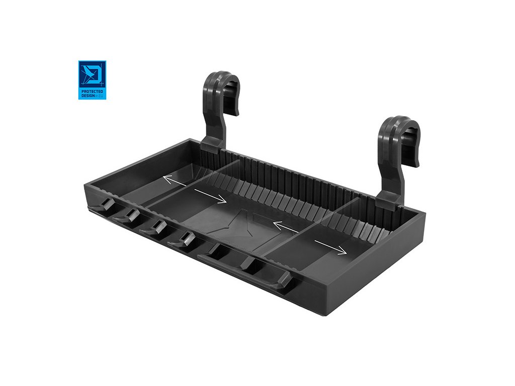 Dalším doplňkem jsou háčky v přední části sloužící pro zavěšení návazců, případně zasunutí jehly, nůžek nebo jiné pomůcky potřebné během lovu. Vyjímatelné přepážky umožňují optimalizovat úložný prostor přesně podle vašich představ. Polička je navržena v oblíbeném černém designu BlackWAY a tedy skvěle doplní stojany z naší produkce.