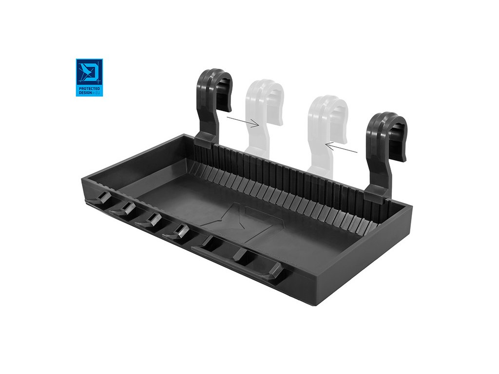 ShelfPOD má vyvýšené okraje, díky kterým zůstanou uložené předměty na svém místě. Dno je perforované a umožňuje vytečení přebytečné vody po dešti. Dva pevné plastové háky umožňují snadné a rychlé zavěšení na stojan a jelikož jsou odnímatelné, je možné si poličku přenést do bivaku nebo na stolek.