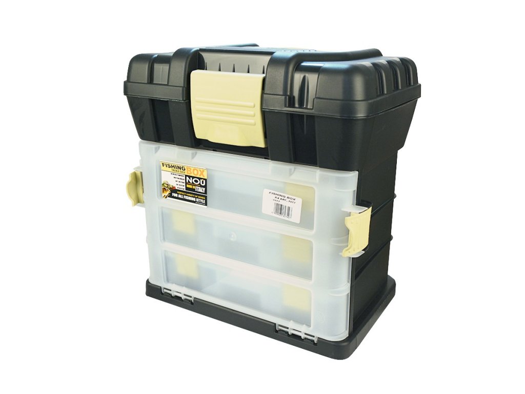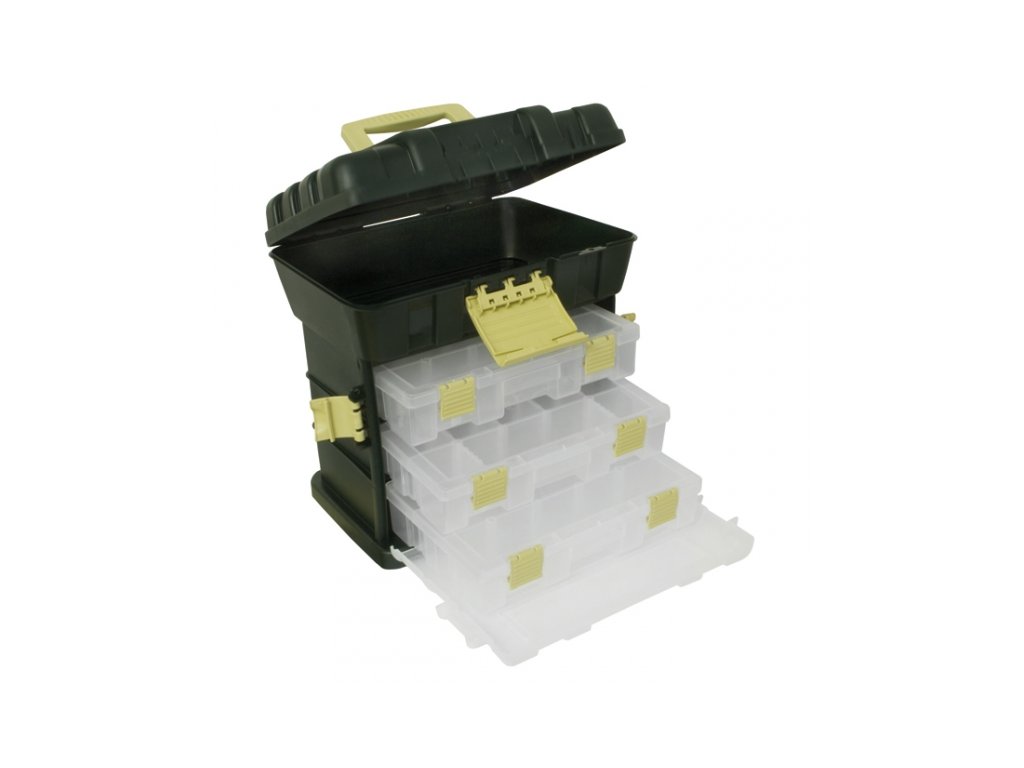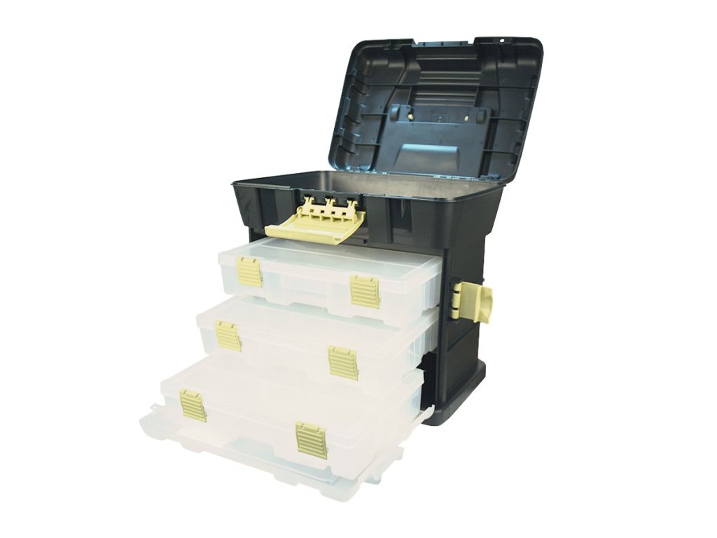 Po otevření krytu umělohmotného boxu uvidíme tři přihrádky o rozměrech 27,5x18x5,5cm. Ty nám poskytují množství prostoru a kombinací rozložení a uspořádání našich rybářských potřeb a bižutérie. Pomocí ní budou naše rybářské potřeby průhledné viditelné a použití. Můžeme mít v jednom boxe pomůcky na různé metody lovu - zvlášť přihrádka na feeder, pro lov na tekoucích vodách atd. Díky tomuto výbornému kufříku nemusíme třídit potřebné pomůcky. Od teď bude všechno na jednom místě, vždy po ruce a použitelné podle aktuálních potřeb. Rozměrnější pomůcky (náhradní navijáky, kleště, olova a jiné) se s přehledem vejdou do otvíratelného vnitřku.