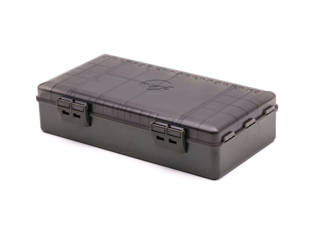 Je vyroben z nárazuvzdorného plastu s průsvitným víkem, které vám umožní vidět dovnitř. Víko je opatřeno pravítkem, které vám umožní přesně měřit vaše návazce, a je upevněno pomocí dvou západkových uzávěrů, aby se zabránilo jakékoli šanci, že se během přepravy otevře. Uvnitř víka brašny Basix Tackle Box je 21 malých západkových přihrádek různých velikostí, které jsou ideální pro uložení předmětů, jako jsou spony a obratlíky. Uvnitř boxu jsou dvě velké přihrádky s pevnými přepážkami, které jsou ideální pro nářadí na návazce, cívky s návazcovými šňůrkami a podobně. Obsahuje také odnímatelnou přihrádku na soupravu se špendlíky, které lze použít k uložení až osmi předvázaných souprav (například Basix Ready Tied Hair Rigs), a pod tímto je další dlouhý úložný prostor.