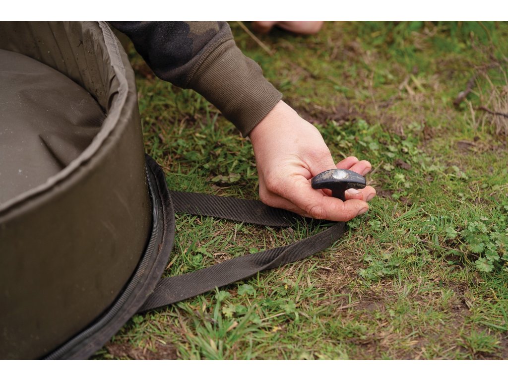 Polstrované stěny pomáhají zajistit, aby váš úlovek zůstal v bezpečí a uvnitř podložky. Když se Basix Carp Cradle nepoužívá, složí se na dvě části a uvnitř je prostor pro uložení Carp Care Kit a Basix Weigh Sling. Držadla na přenášení lze také použít k přichycení pomocí kolíku k zemi.