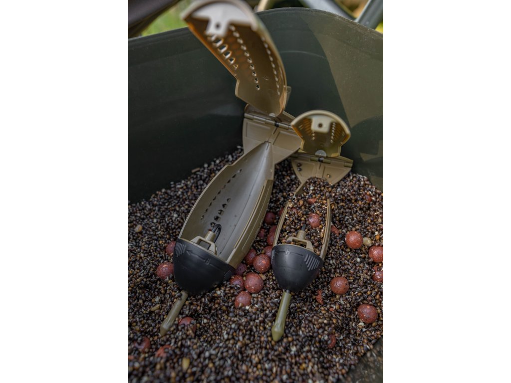 Nejlepší Bait Bopper na návnady. Korum Bopper je vybaven unikátním dovažovacím systémem, kde lze pomocí vymenitelných závaží nastavit nejen rychlost potápení ale i hmotnost Bopperu. Závaží má tvar koblihy a dává se do na vnitrní cásti telícka. Závaží mohou být zajištené na míste malým rucním koleckem uvnitr telícka. To dává rybárum poprvé možnost jemne upravit hmotnost svého Bait Bopperu. A co víc, samotný Bopper byl navržen tak, aby byl velmi aerodynamický díky tvaru rakety, který volne létá vzduchem a propadá vodou. Kridélka vzadu stabilizují Bopper, což zajištuje, že ho mužete velmi presne nahazovat. Hlavní cást s dutinou je vyrobena ze dvou cástí, které jsou pružinové, aby se otevrely, když Bopper narazí na dno reky nebo jezera. Samotné telo má otvory, aby bylo mnohem snazší ho stáhnout zpet v rychle tekoucí vode. Plnení návnady dovnitr Bopperu je snadné a díky tvaru hlavní dutiny se dovnitr vejde mnohem více návnad, než do podobných produktu. Dostupné jsou dve velikosti Bopperu, které vyhovují ruzným požadavkum a každou verzi lze použít s vnitrním závažím nebo bez nej dle potreby. Možnost ucinit jej težším, pokud je prutok mnohem vyšší, urcite bude vyhovovat spouste rybáru, lovících na rekách a s feederem. Verze Standart je dodávána se základním hmotností 30 g a 2-mi dalšími 30 g závažími. Verze XL je dodávána se základní hmotností 60 g a 3-mi dalšími 30 g závažími. K dispozici je také speciální prut Bopper Baiting Up Rod a šnura Bait Up Braid.