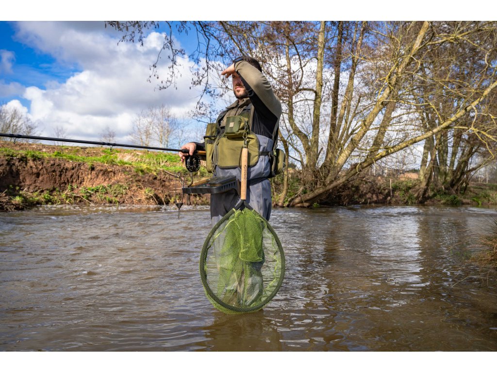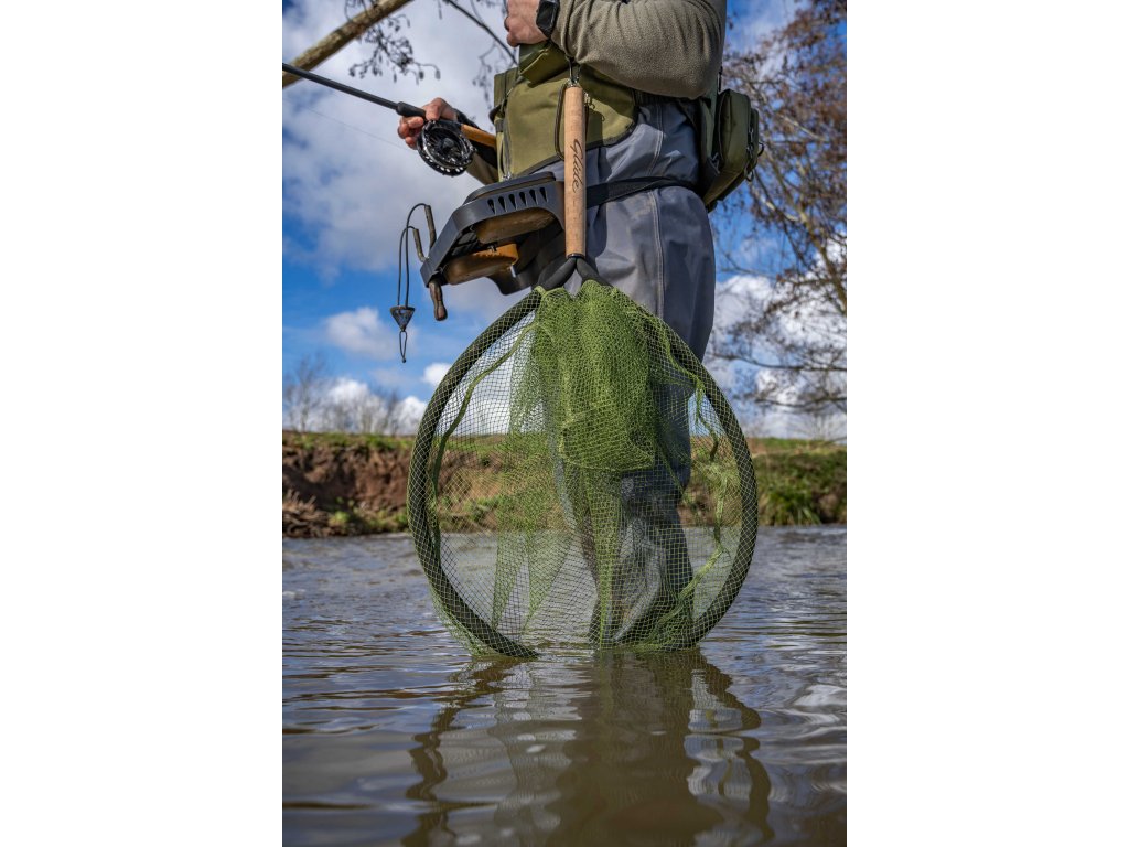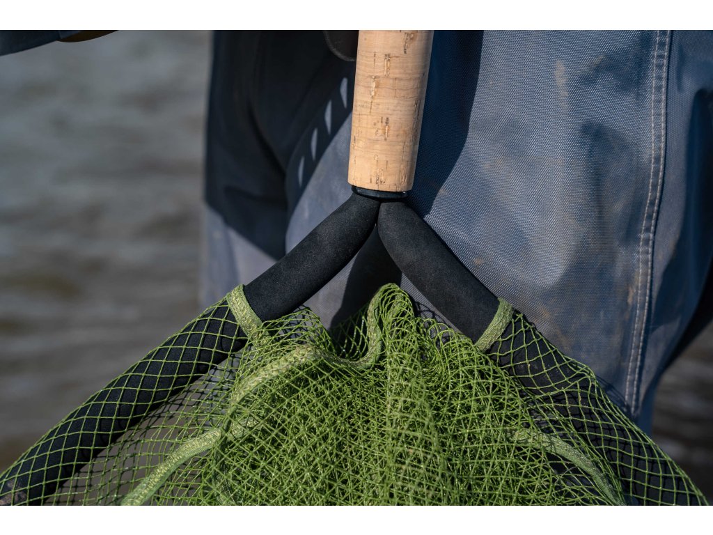 Podběrák je vybaven latexovou síťkou šetrnou k rybám a velmi odolným rámem z materiálu EVA. V rukojeti z tvrdého korku je integrovaný magnet, doplněný o natahovací gumovou bezpečnostní šňůru. Ta zajišťuje, že pokud podběrák při brodění upustíte, neodplave po proudu.