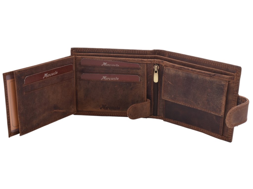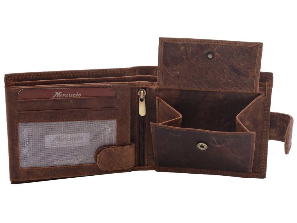 Kvalitní kožená peněženka s vnějším zapínáním vyrobená z pravé kůže. Peněženka je ozdobena dvojitým obšitím, což podtrhuje tvar peněženky. Vnitřek, tak i vnější strana, má zapínání, takže pokud preferujete zapínání, tento model je pro vás jako stvořený. Peněženka obsahuje 7 přihrádek na karty a doklady, a dokonce i několik průhledných přepážek, které jsou vhodné pro fotky. Mincovník je dostatečně prostorný i pro větší objem mincí. Tento prostor může být zvětšen o jednu zipovou přihrádku uprostřed peněženky. Bankovky si můžete uložit do dvou přihrádek na bankovky nebo si je můžete schovat do tajných univerzálních přihrádek.
