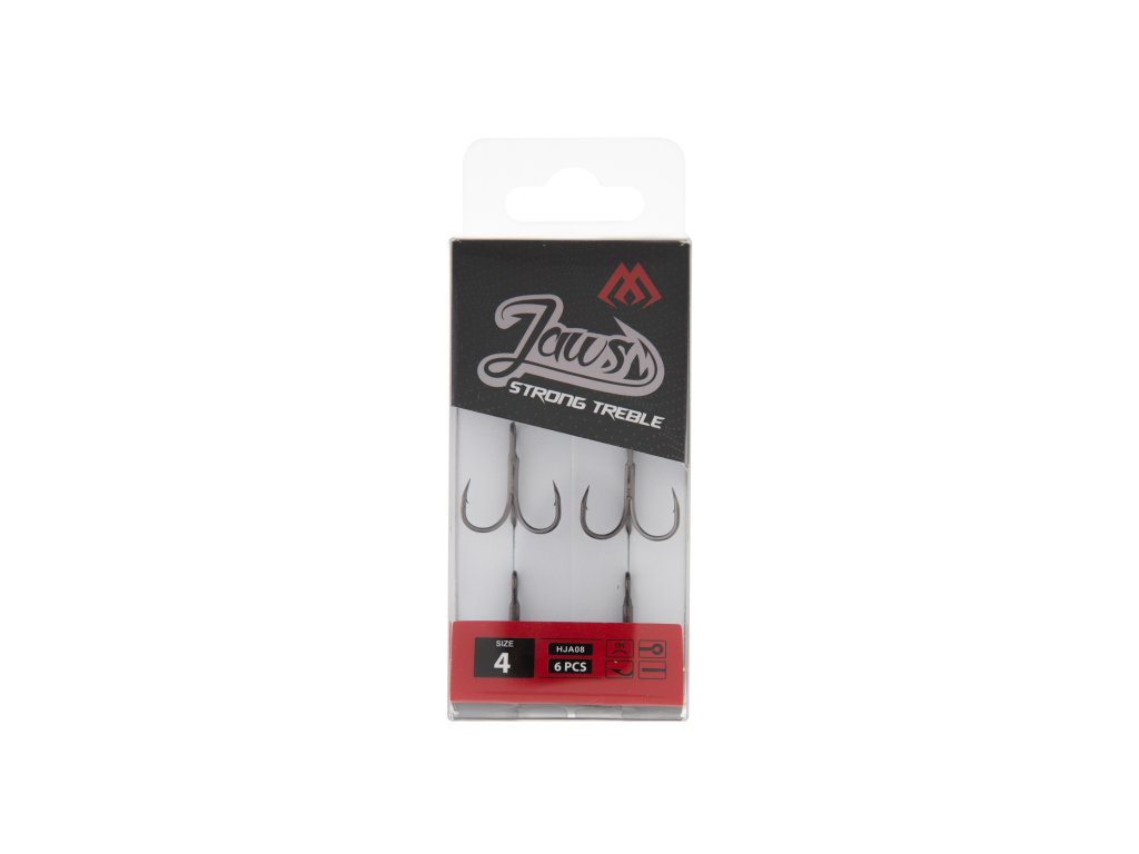 Vysoce kvalitní, velmi ostré a silné trojháčky - řady JAWS. Krátký dřík minimalizuje riziko zamotání dvou trojháčků během nahazování, zatímco zahnutý hrot zvyšuje účinnost zdolávání. Navrženo pro lov trofejních ryb.
