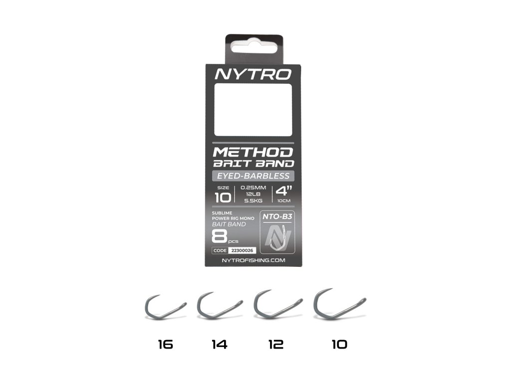 Návazce Nytro Method Bait Spike Hooks to Nylon – série B3 – jsou určeny pro lov velkých bojovných ryb, u nichž je rozhodující maximální pevnost a síla háčku. Tyto návazce o délce 10 cm a vybavené gumičkou na nástrahu, umožňují rychlé a přesné podání nástrahy– ideální pro wafters a tvrdé pelety při lovu na method feeder.