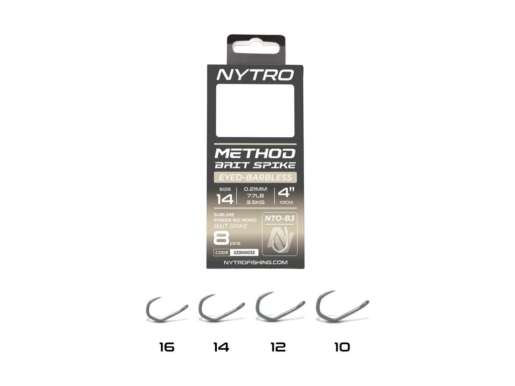Návazce Nytro Method Bait Spike Hooks to Nylon – série B3 – jsou určeny pro lov velkých bojovných ryb, u nichž je rozhodující maximální pevnost a síla háčku. Tyto návazce o délce 10 cm a vybavené trnem na nástrahu, umožňují rychlé a přesné podání nástrahy– ideální pro wafters a (pop-up) mini boilies při lovu na method feeder.