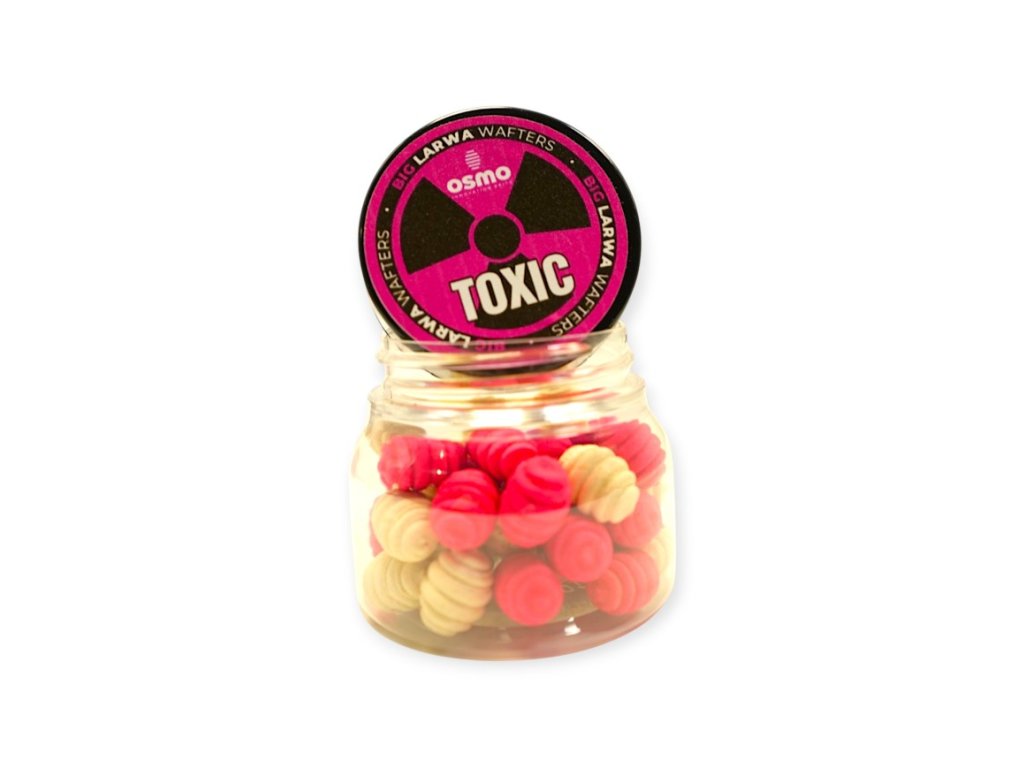 OSMO Mini Larwa Wafters jsou inovativní nástrahy vyznačující se jedinečným tvarem a velkou mm velikostí. Jedná se o neutrálně vyváženou nástrahu skvělou pro lov na method feeder. Toxic má nepříjemné, velmi výrazné aroma a v balení je ve dvou barvách – bílé a růžové.