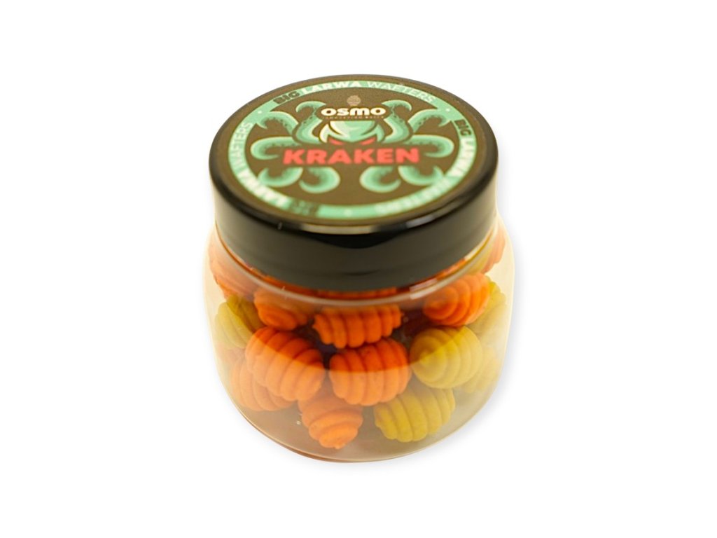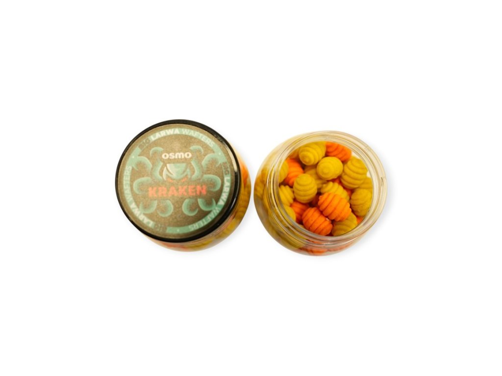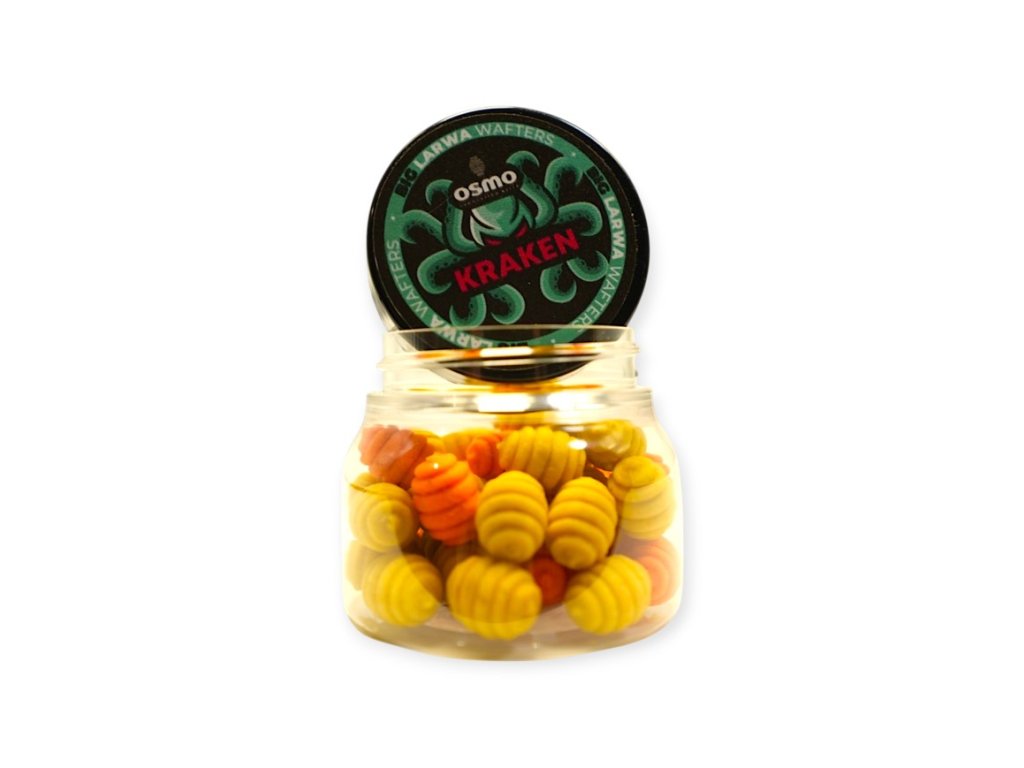 OSMO Big Larwa Wafters jsou inovativní nástrahy vyznačující se jedinečným tvarem a velkou velikostí. Jedná se o neutrálně vyváženou nástrahu skvělou pro lov na method feeder. Příchuť Kraken je unikátní larva, která kombinuje sladkou vůni jižního ovoce s brutální silou živočichů mořského dna. Společně vytvářejí mimořádně zajímavou směs vůní. Provedení ve 2 vypraných barvách a to oranžové a žluté. Atraktivní tvar, zajímavé aroma a perfektní akce této nástrahy znamenají, že kolem ní žádný kapr nemůže lhostejně proplout. Nejlepší prezentace dosahují nástrahy na bajonetech . Velikost larev 7mm x 10mm.