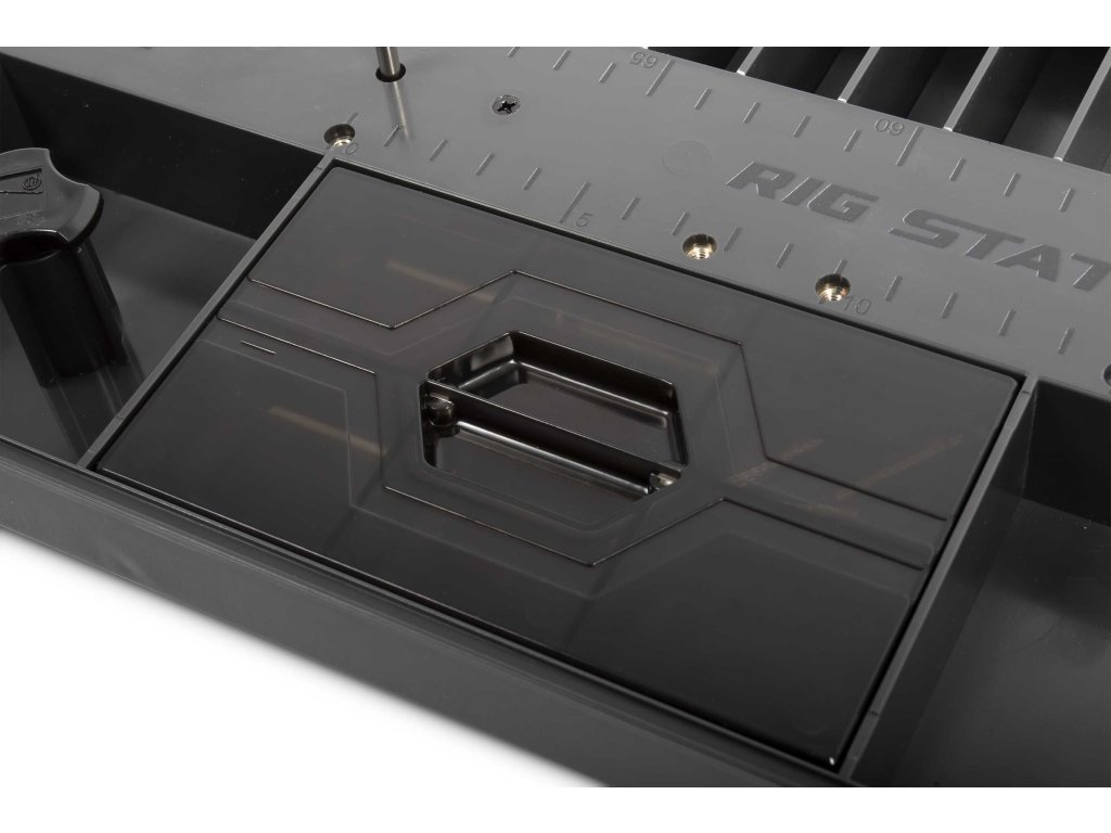 Rig Station je ideální pro přípravu navázaných udiček a návazců, protože se v ní skladují všechny základní materiály pro výrobu návazců, jako jsou vlasce, bročky, splávky a drobné příslušenství, například háčky a silikonové hadičky.