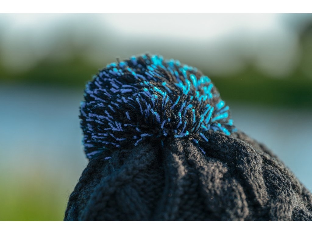 Pletená čepice s bambulí v černé barvě s akcentem modro/černé bambulky. Má hřejivou fleecovou podšívku, takže je ideální pro nejchladnější zimní dny u vody.