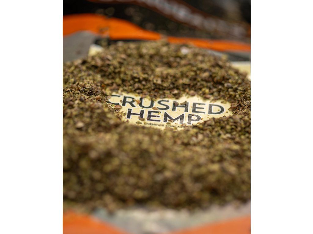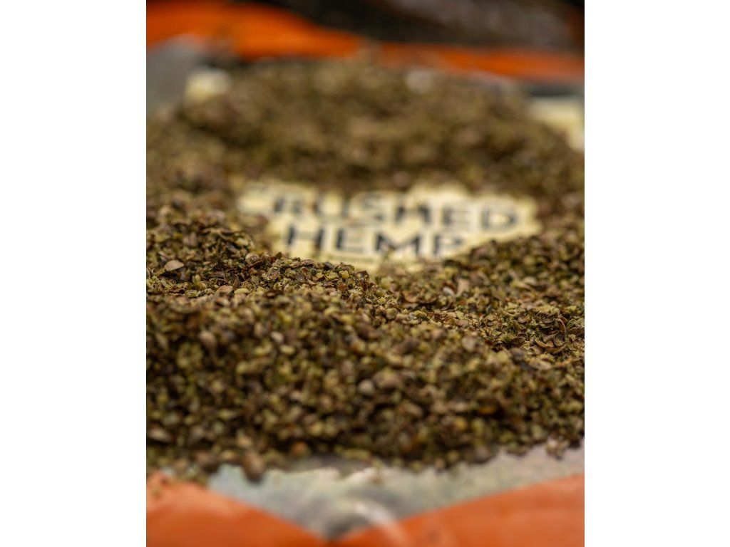 Drcená konopná semena; dodávají bohatou konopnou chuť a zvyšují hrubost krmení.