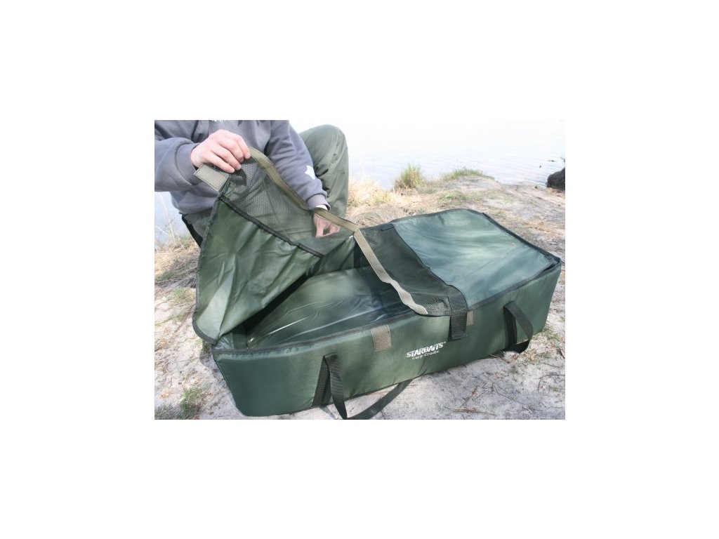 Silně polstrovaná podložka té nejvyšší kvality. Síťované dno pro odtok vody a extrémně silná matrace, kterou lze snadno vyndat a očistit díky gumovému potahu. Víko na suché zipy pro bezpečné přenášení ryby, ucha na přenášení. Speciální výklopná polstrovaná podložka pod kolena rybáře při focení ve špatném počasí. Součástí je i kvalitní transportní obal s popruhem přes rameno. Rozměry: 90 x 55 x 21,5 cm (dxšxv)