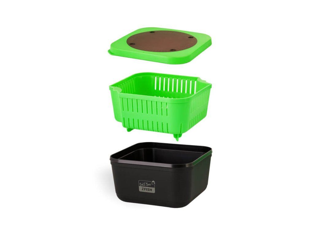- Box má perforované víko, je proto ideální pro živé nástrahy (červy, žížaly), které tak dostávají přísun vzduchu.